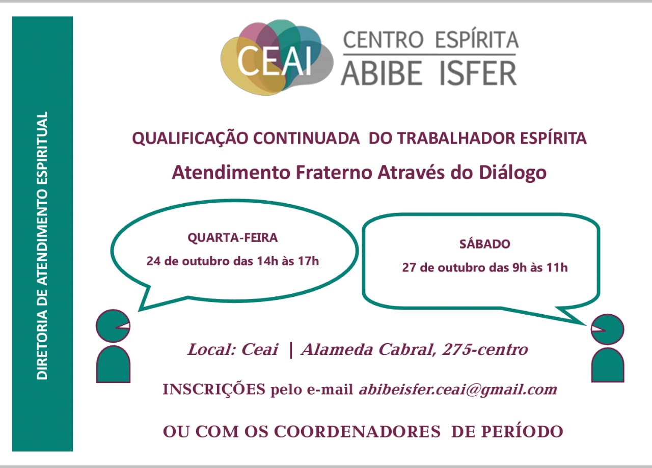 Atendimento Fraterno Através do Diálogo 23 de outubro de 2018 Comentários desativados em Atendimento Fraterno Através do Diálogo Qualificação continuada do Trabalhador Espírita Atendimento Fraterno Através do Diálogo Quarta-feira, dia 24 de outubro, das 14h às 17h e Sábado, dia 27 de outubro, das 9h às 11h. Inscrições pelo e-mail: abibeisfer.ceai@gmail.com